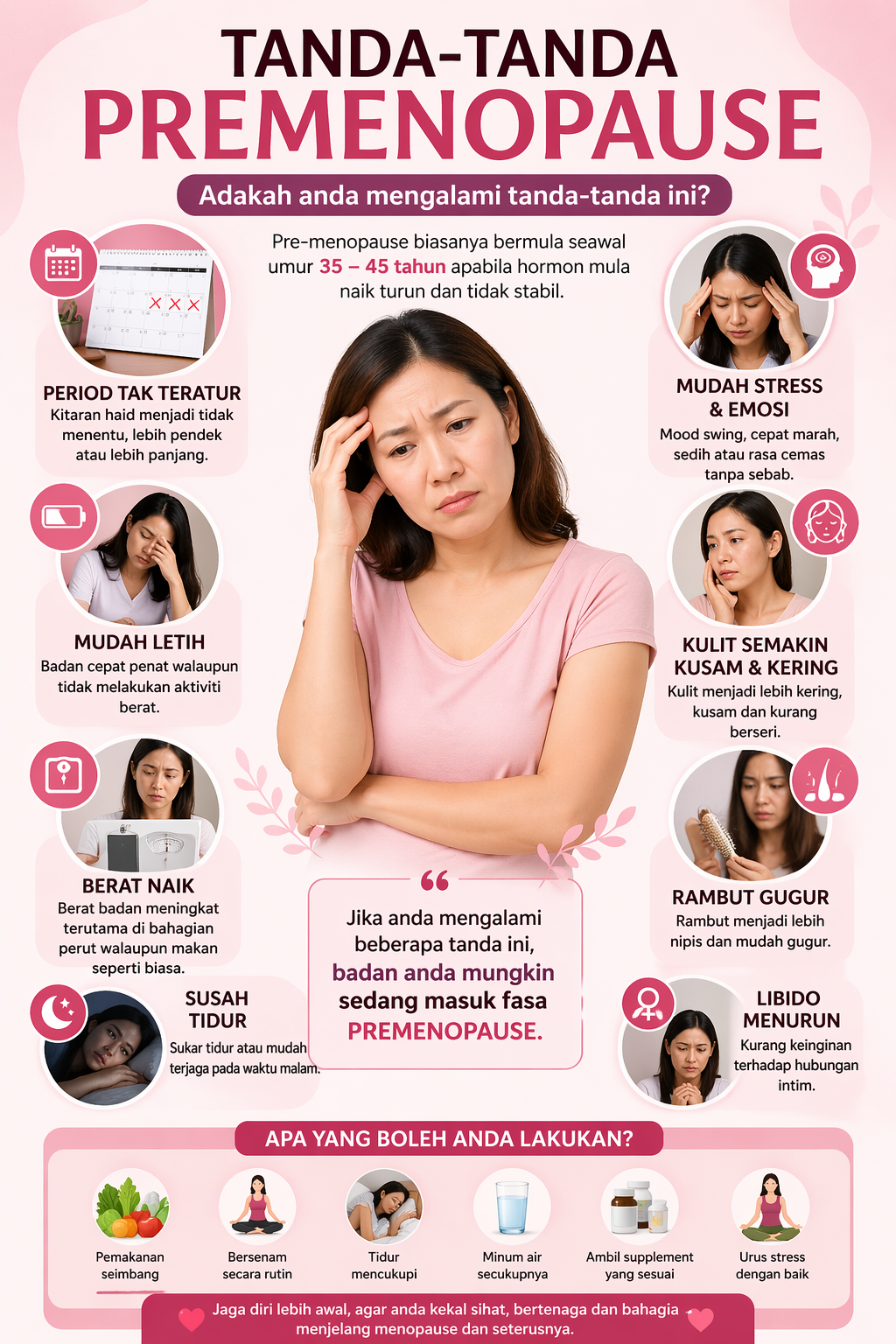 - Perubahan Fizikal Lain: Peningkatan berat badan, terutamanya di kawasan pinggang, kulit kering, rambut nipis, dan masalah pundi kencing.