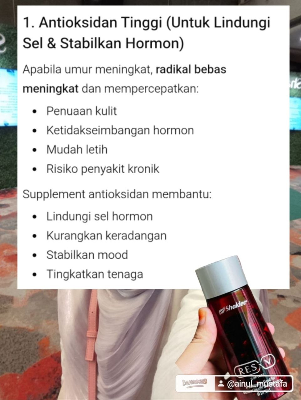 Resv Vivix paling best untuk tenaga , kulit. Siapa nak awet muda tu wajib ambil ini. Dan resv vivix bantu jaga kesihatan dari peringkat sel. Bantu elak masalah jantung, kolesterol tinggi, paru paru, kuatkan imun. Mahal tapi berbaloi dengan khasiat dia. dan di dalam Resv ada bahan untuk masalah faraj kering. So siapa ada masalah libido tu wajib ambil ResV. hehe