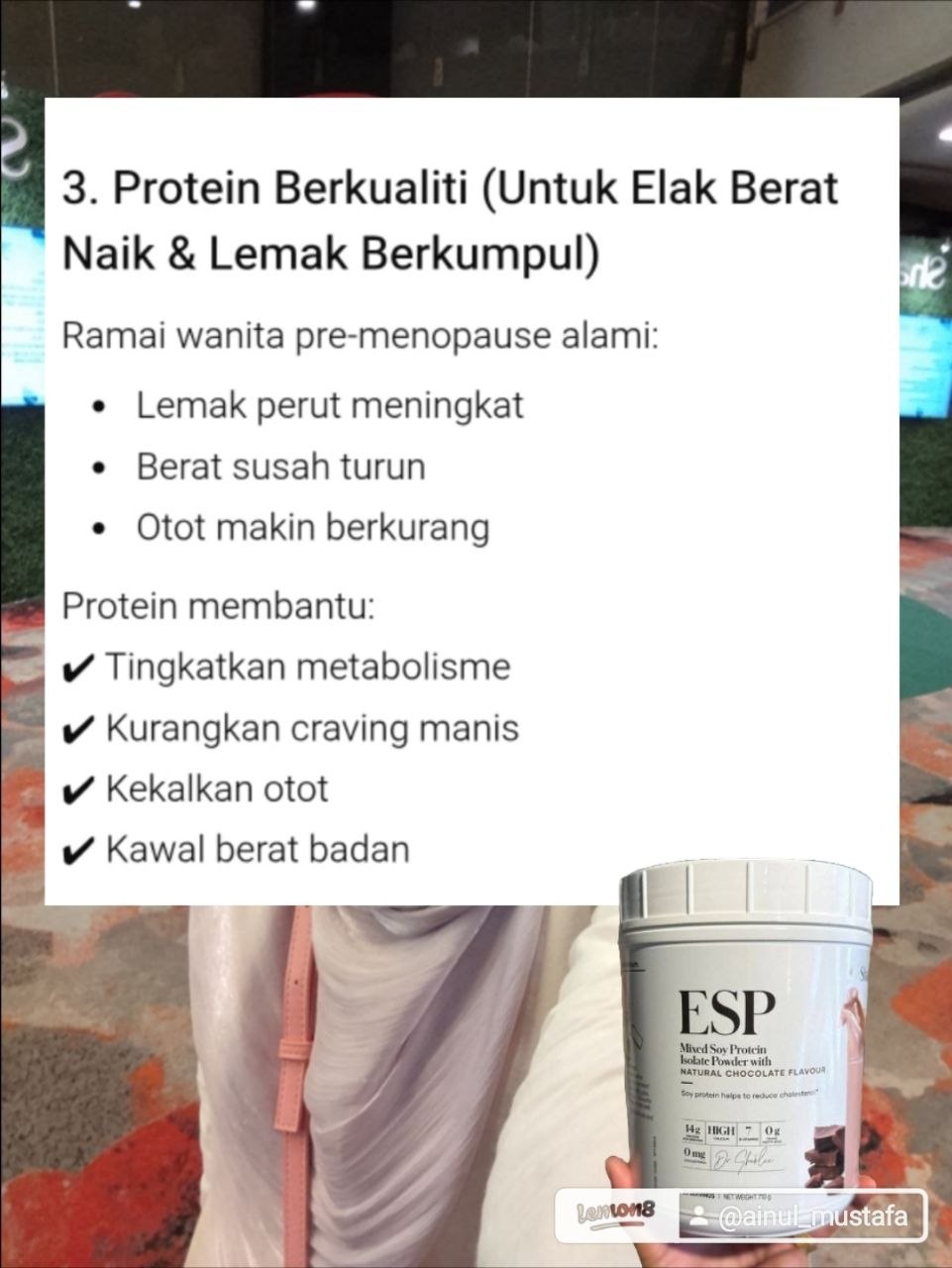 Protein penting untuk bina otot. makin kita berusia kena jaga otot tau. Bila otot tak cukup tu yang jadi penat tak bertenaga. protein juga penting untuk bina hormon, untuk sistem imun. Ni siapa ada masalah rambut gugur , kulit kering, jeragat kena ambil esp ni. ESP juga bagus untuk mereka yang ada masalah gastrik, gerd. dah makin berusia ni perut makin sensitif kan. so dari mimun 3in1 yang tinggi gula boleh sebabkan gula dalam darah naik baik la amalkan ESP ni. Glisemiks indeks pun rendah.
