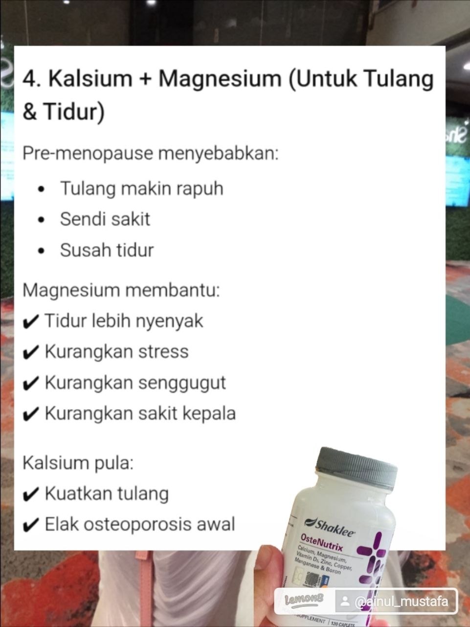 Makin kita berusia atas umur 30tu kena la jaga bab kalsium ni. seba bila tak cukup tu yang bila menopause lagi berisiko dapat osteoporosis. jatuh sikit tulang cepat patah retak. sebab tulang kita tak padat. ostenutrix ni juga bantu tidur lena. inilah rahsia saya boleh tidur lena dengan gembira. ostenutrix juga bantu relaxkan otot. ishh memang sedap la makan ostenutrix ni. dah kena memang jatuh cinta. badan jadi sedap